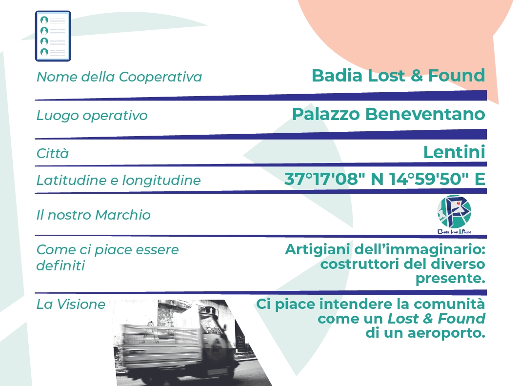 La società cooperativa “Badia Lost & Found” è un’organizzazione che da quattro anni ha avviato un processo di riattivazione del sito comunale denominato Palazzo Beneventano, il quale, prima del nostro arrivo, si presentava dismesso e per troppo tempo destinato ad usi impropri (quale deposito dei mezzi della nettezza urbana – anni ’70/’80, ma anche “palestra per vandali”, prontamente vietata con il presidio culturale in oggetto). Il sito è una dimora storica appartenuta alla famiglia Beneventano, baroni della Corte, risalente alla ricostruzione post-sisma 1693; uno degli esempi tangibili del noto architetto eclettico Carlo Sada.